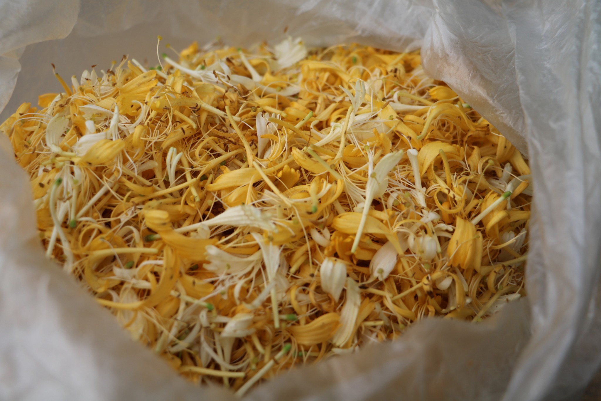 金銀花,一蒂二花,黃色為金,白色為銀,成雙成對,有鴛鴦藤美名,象徵全心全意地奉獻,而這樣的象徵,展露在黃穎夫婦身上,從先生的罹病,到尋求治療,到栽種金銀花,兩人齊心,為金銀花奉獻,為彼此奉獻。