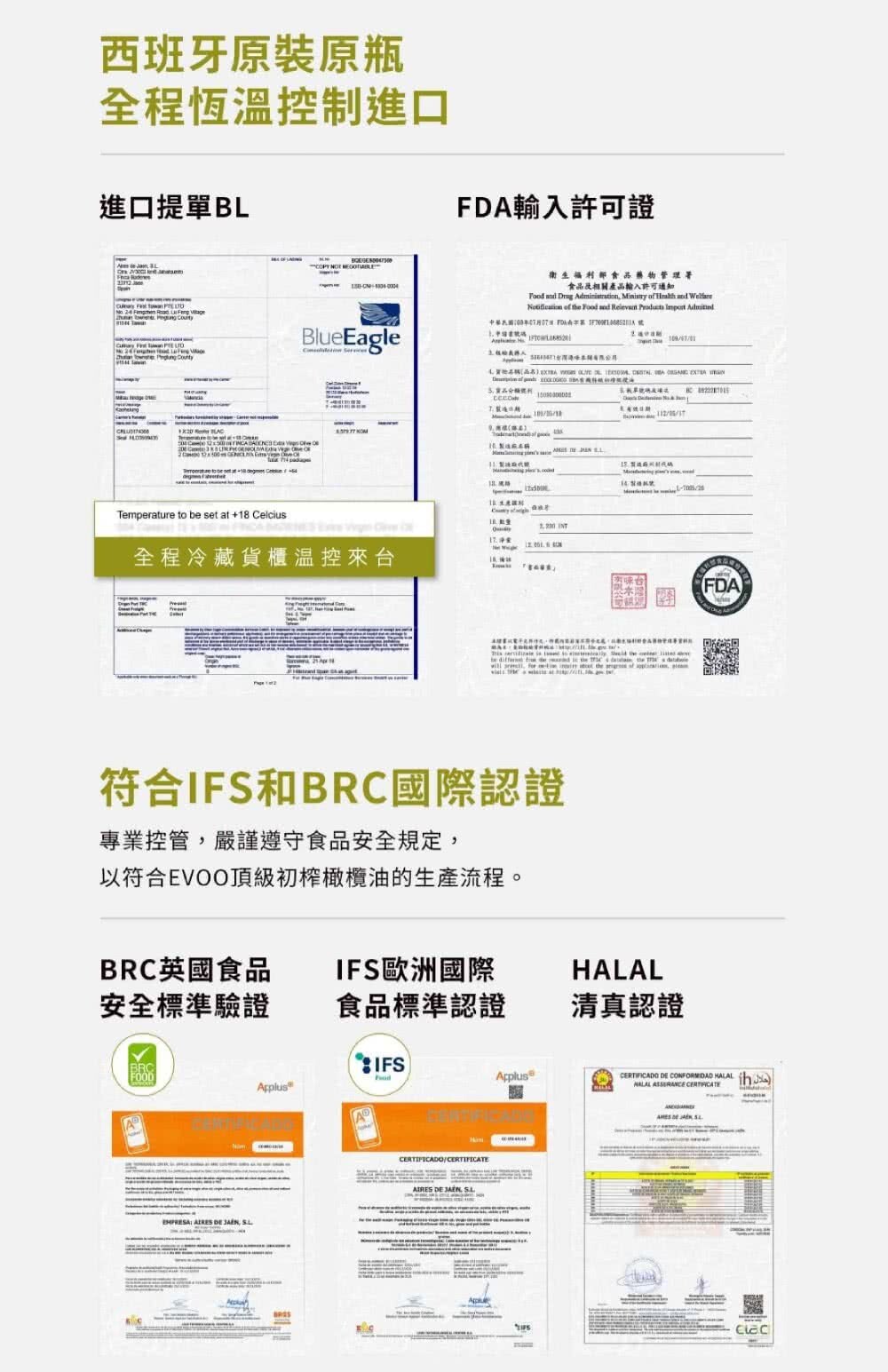 全品項橄欖油皆符合IFS和BRC國際認證,對食品安全和環境保護有高度的成諾,並著重橄欖油的品質,為的就是給予消費者優質的橄欖油。
